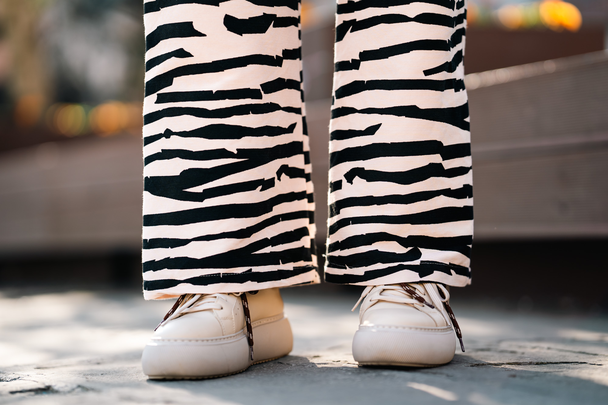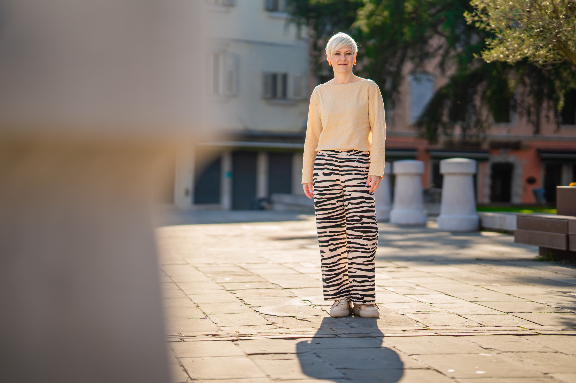 Elegantne zebra hlače iz bombaža in svile, ki združujejo udobje in drznost.