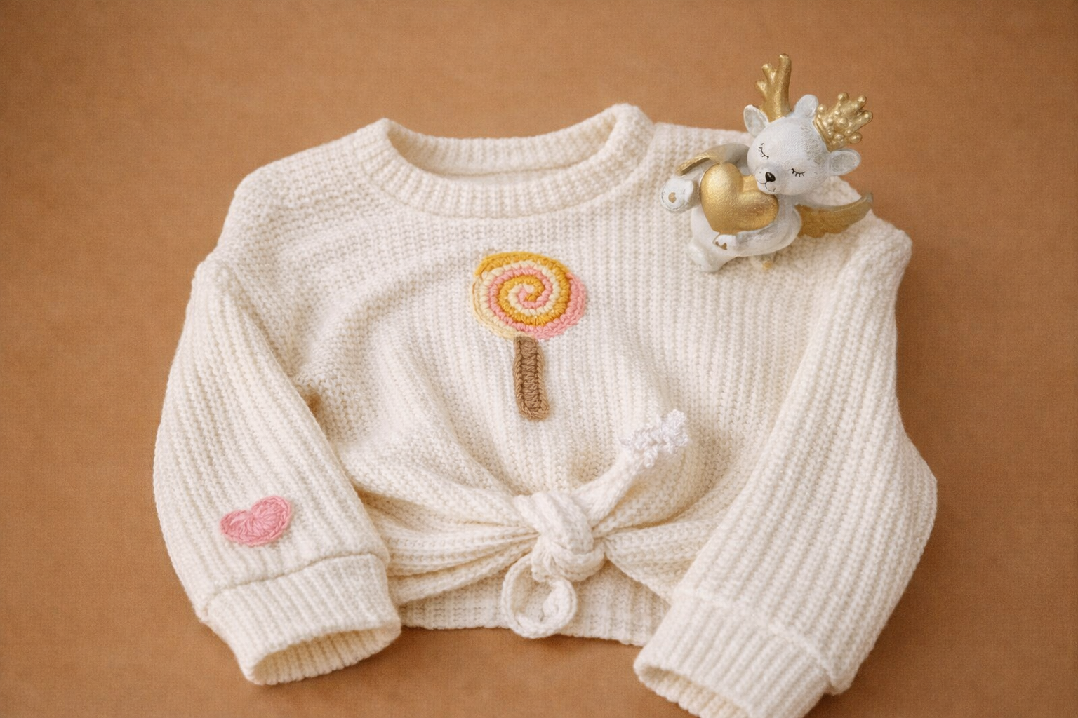 Mehak in udoben otroški puloverček, zasnovan za vsakodnevno nošenje in prijetno udobje. Klasičen kroj omogoča enostavno oblačenje in kombiniranje z različnimi oblačili. Posebnost puloverčka je kvačkan motiv lizike na sprednjem delu, srčka na rokavu ter dekorativen vozel na spodnjem robu, ki doda igriv in sodoben videz. Puloverček je primeren za igro, sprehode in posebne priložnosti ter nudi mehak občutek na koži.